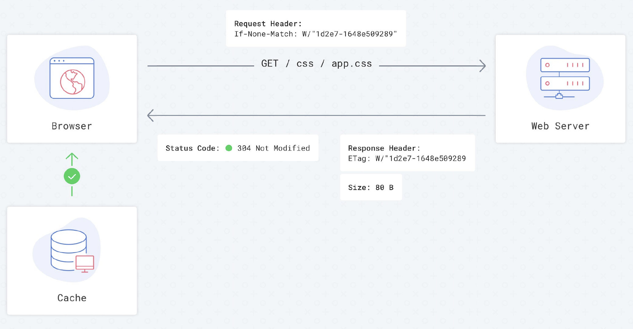 启用 Etag 缓存策略后,我们总是会去服务器检查文件的哈希值,然后浏览器才会决定从缓存中提取文件或将其完全加载。