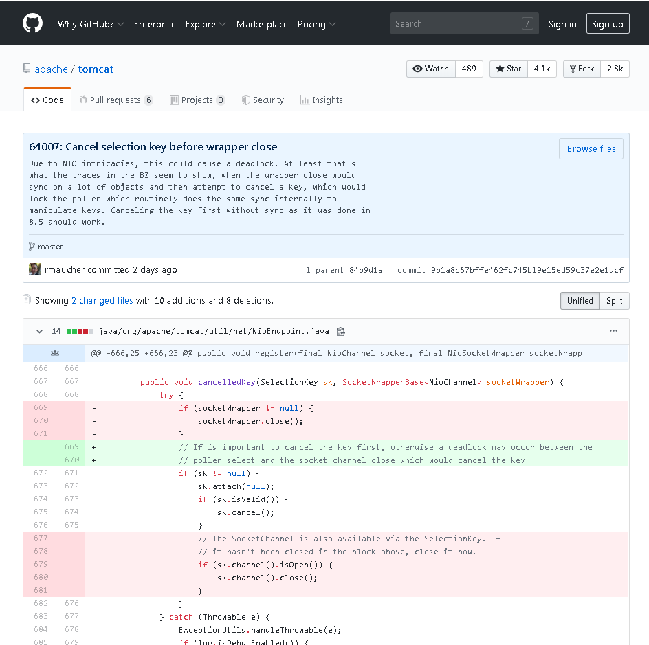 Remy Maucherat很快就进行了修复,主要是把Poller.canceledKey中close移到了finally中去执行,也就是先让Poller.run获得锁。