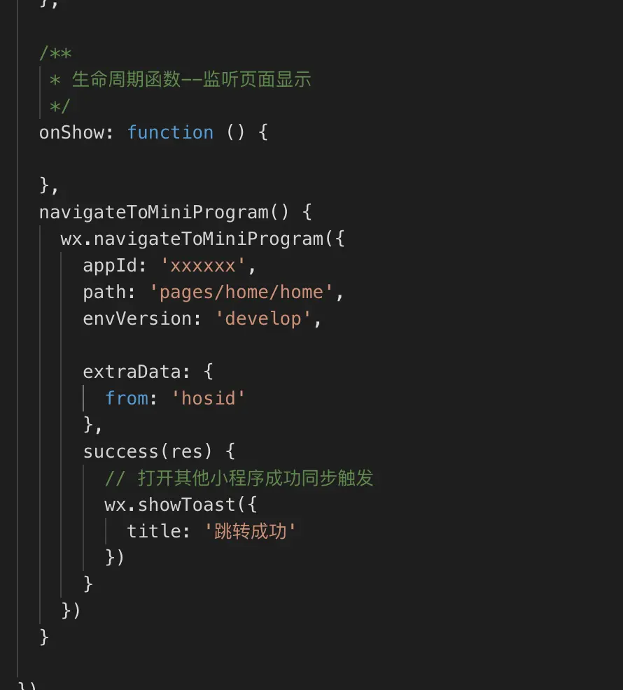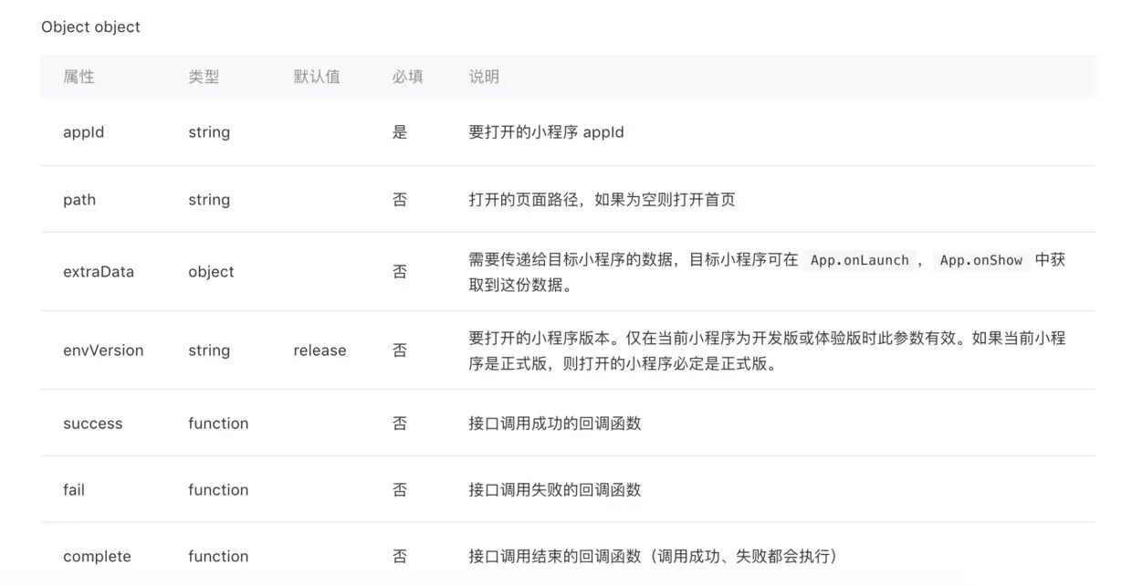 从 2.4.0 版本以及指定日期(具体待定)开始,开发者提交新版小程序代码时,如使用了跳转其他小程序功能,则需要在代码配置中声明将要跳转的小程序名单,限定不超过 10 个,否则将无法通过审核。该名单可在发布新版时更新,不支持动态修改。配置方法详见 配置。调用此接口时,所跳转的 appId 必须在配置列表中,否则回调 fail appId "${appId}" is not in navigateToMiniProgramAppIdList。