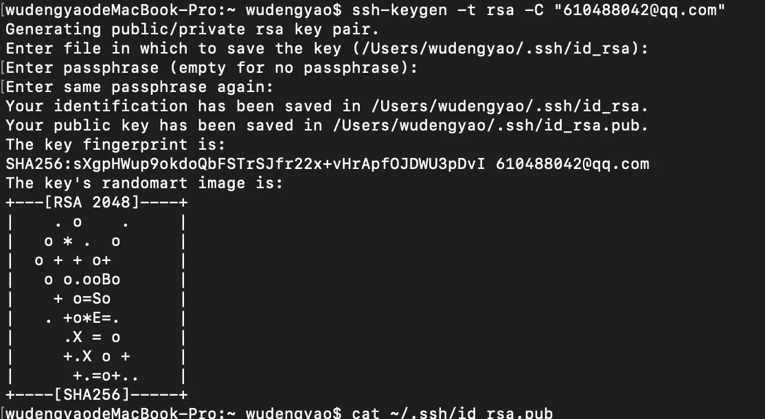 配置成功,输入cat ~/.ssh/id_rsa.pub,就会显示你配置的公钥。然后在码云上设置你的公钥。