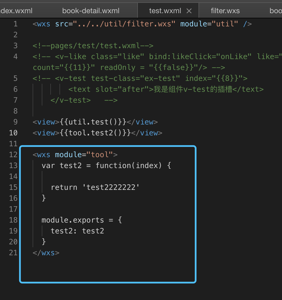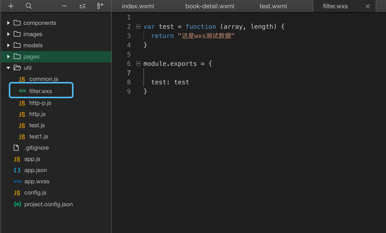 小程序wxs的使用(一) 程序员三千_ 2020-01-13 122 阅读1分钟 基本概念 注:wxs虽然与JavaScript是不同的语言,但我们在写wxs的时候,可以按照es5的语法去写,当你碰到错误的时候,再去小程序的官方文档里去查找,而直接看wxs语法是没必要的,我个人觉得。接下来我们写一段wxs代码测试一下: 现在util里新建一个wxs文件,名字叫做filter,filter.wxs里的代码如上图。 我们再在页面上调用这段代码: 结果确实输出了函数test里的返回值“这是wxs测试数据”。 当然,我们也可以在wxml里直接写wxs的代码,如上图
