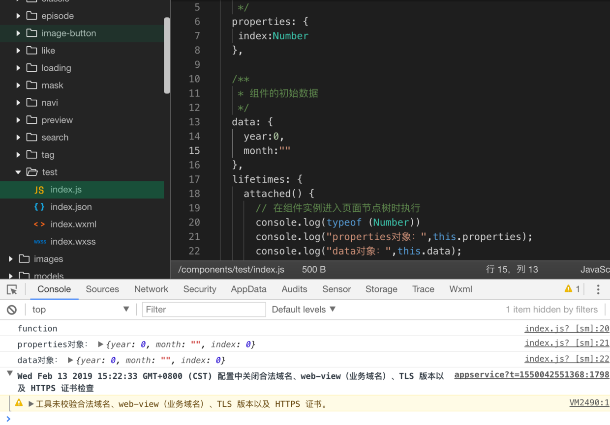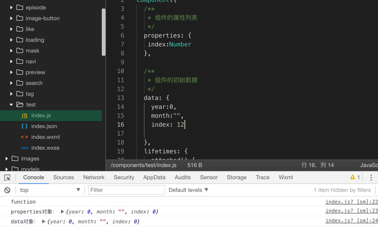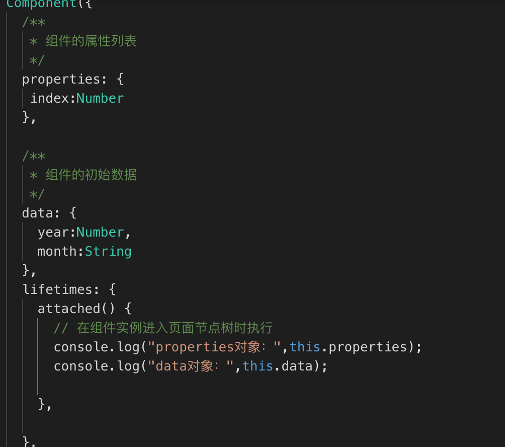 现在,我们在组件的properties里定义一个index为Number类型,在data里定义一个year为Number类型,定一个month为String类型,然后我们在组件的生命周期函数attached里打印出properties和data两个对象,我们看看里面的值。