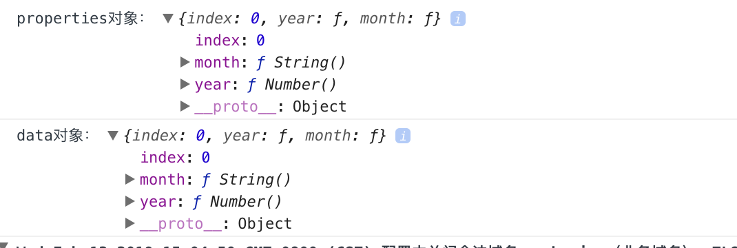 我们看日志打印出来,发现两个奇怪的现象:1、对properties里index打印出来的默认值是0,而对data下面的year和month都打印出JavaScript两个内置函数,一个是String()、一个是Number()。2、不管我们打印的是this.properties还是打印this.data,他们的显示结果是一模一样的。其实我们在properties是没有定义year和month的,在data里,是没有定义index,为什么会这样呢?