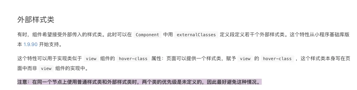 注意:在同一个节点上使用普通样式类和外部样式类时,两个类的优先级是未定义的,因此最好避免这种情况。