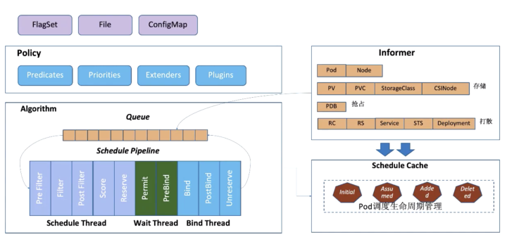 Kubernetes 作为当下最主流的容器自动化运维平台,作为 K8s 的容器编排的核心组件 kube-scheduler 将是我今天介绍的主角,如下介绍的版本都是以 release-1.16 为基础,下图是 kube-scheduler 的主要几大组件: