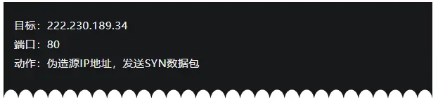 读完消息后,阿D使用原始套接字构造了一个TCP数据包,将SYN标记点亮,伪造了一个源IP地址,将其发送了出去。