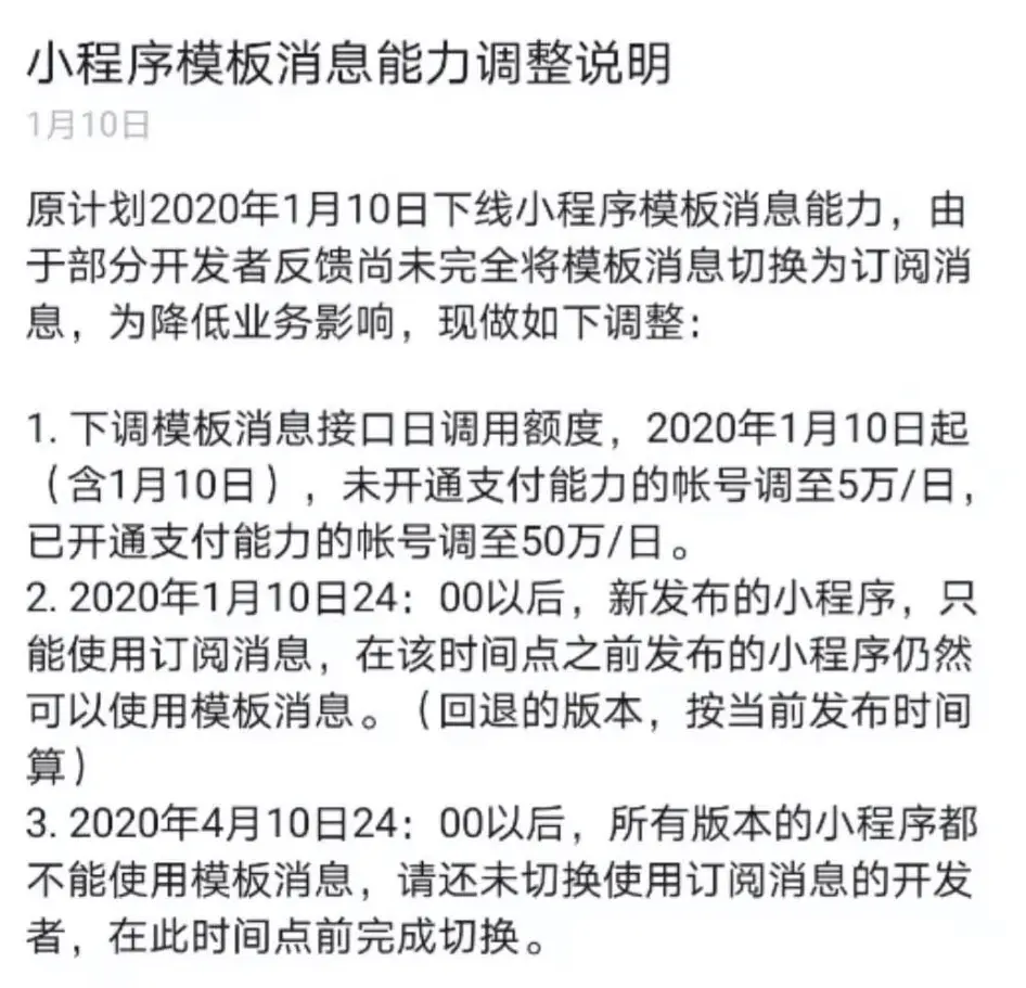微信官方为提升小程序模板消息的使用体验,调整了模板消息的下发条件。原有的模板消息将升级为「订阅消息」,而模板消息接口于 2020 年 4 月 10 日下线(在 2020 年 1 月 10 日以后新发布的小程序只能使用订阅消息),届时将无法再使用原接口推送模板消息,因此需要开发者及时进行调整。