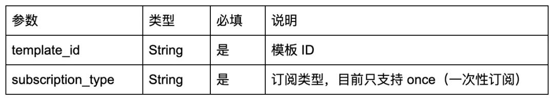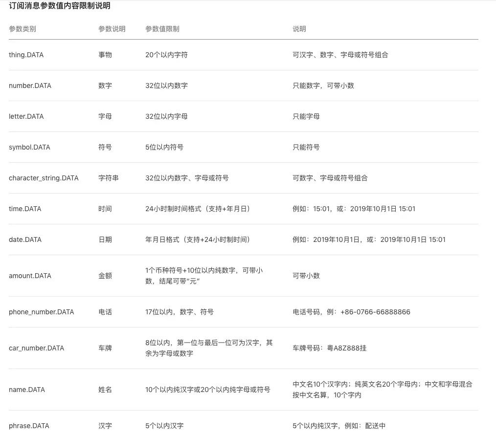 现在的「订阅消息」更像是一个开关,需要用户主动点击授权之后才能获取下发消息权限,用户接不接收消息,接收什么订阅消息,决定权在用户手里。另外订阅消息还严格控制了数据类型和长度,不符合要求的将无法下发。(血泪教训啊,并且你只有在添加模板之后才能知道这个字段是属于什么类型,对于带变量的模板消息千万要注意变量是否符合字段要求)。