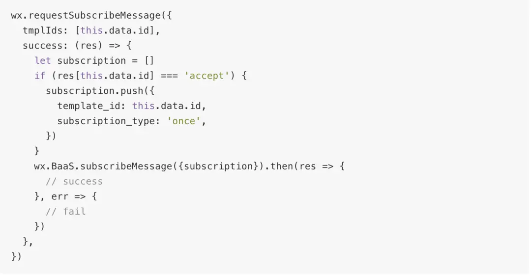 在函数内我们会调用微信 API wx.requestSubscribeMessage 申请发送订阅权限,弹窗出来后,我们会收到 success 回调,当用户在弹窗同意订阅后,即上报订阅结果为 accept ,将订阅的 template_id (模板 ID)和 subscription_type(订阅类型)存入 subscription 数组中,最后在调用 SDK 进行上报即可。