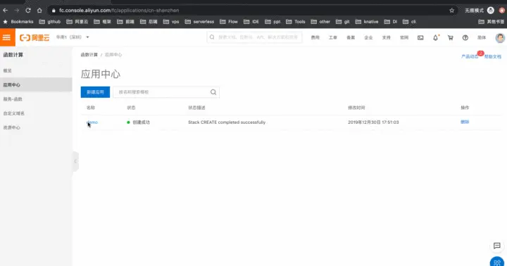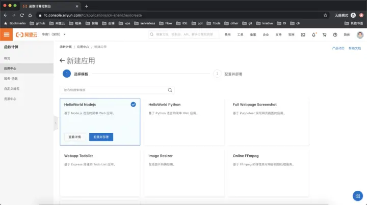 在函数计算应用中心页面里,包含以下操作: