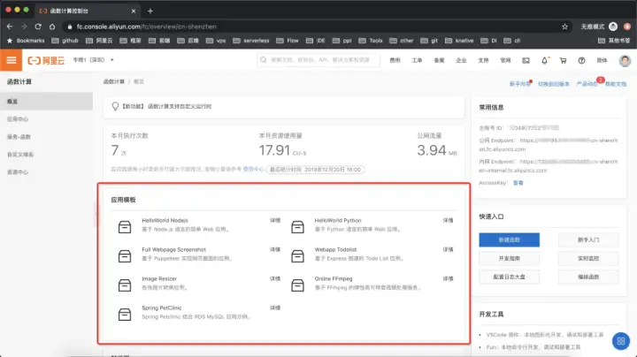 在函数计算控制台概览页中,提供了一个应用模板展示区域,可以通过该区域了解应用中心有哪些应用模板,并快速基于某个应用模板创建应用。