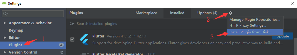 File ->Settings -> Plugins -> ⚙(齿轮图标) -> Install Plugin from Disk…