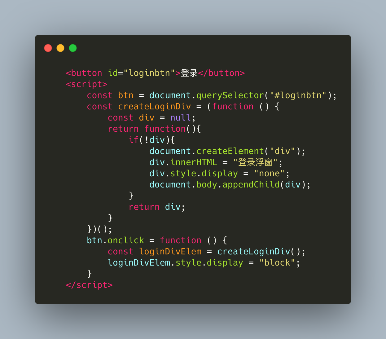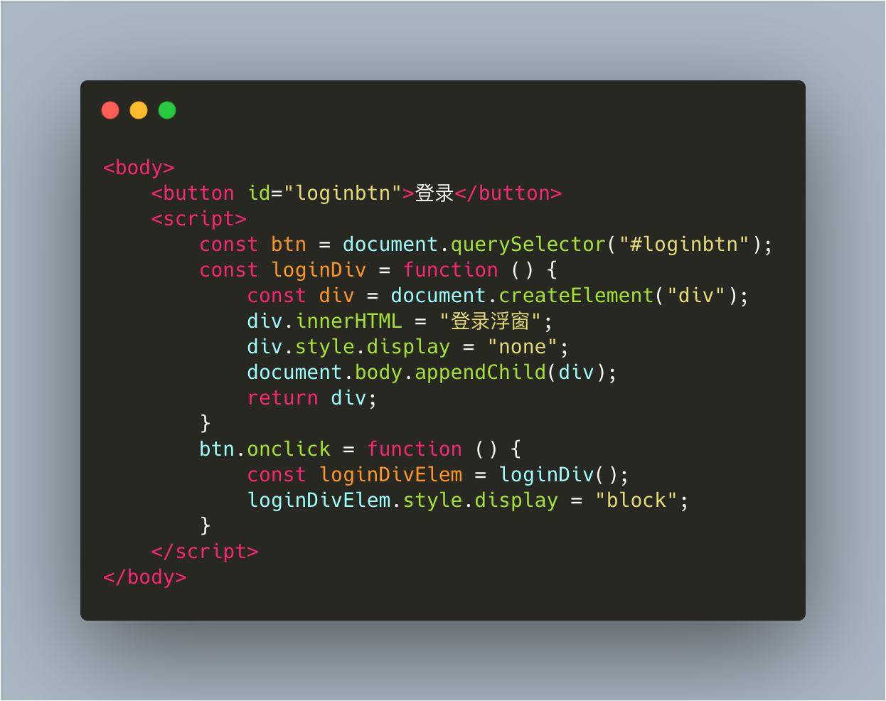 这样的问题就是,如果用户进来后所有的操作根本没有用到登录,那创建登录框这个操作就是无用的,所以改进为当用户点击登录按钮时才开始创建登录框,如下: