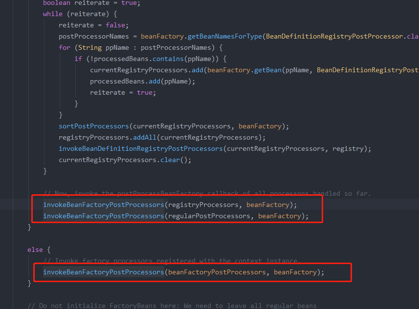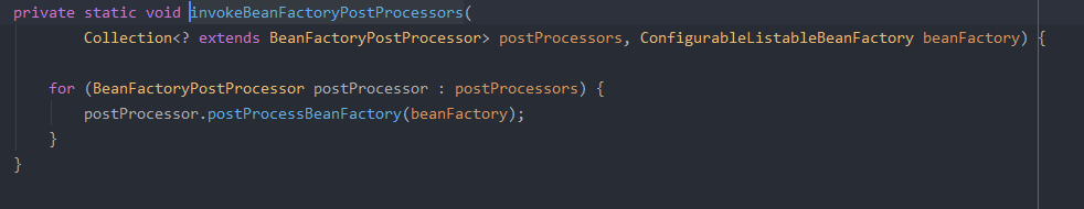 首先根据测试类里AnnotationConfigApplicationContext类进入refresh() 方法,然后调用invokeBeanFactoryPostProcessors(beanFactory)方法,最终进入该方法,循环时会调用自定义实现BeanDefinitionRegistryPostProcessor的类里的postProcessBeanDefinitionRegistry方法,此时会传入spring容器实现的BeanDefinitionRegistry,自定义实现的类里方法可以自定义相关的BeanDefinition,包括新增,以及修改原有的属性。