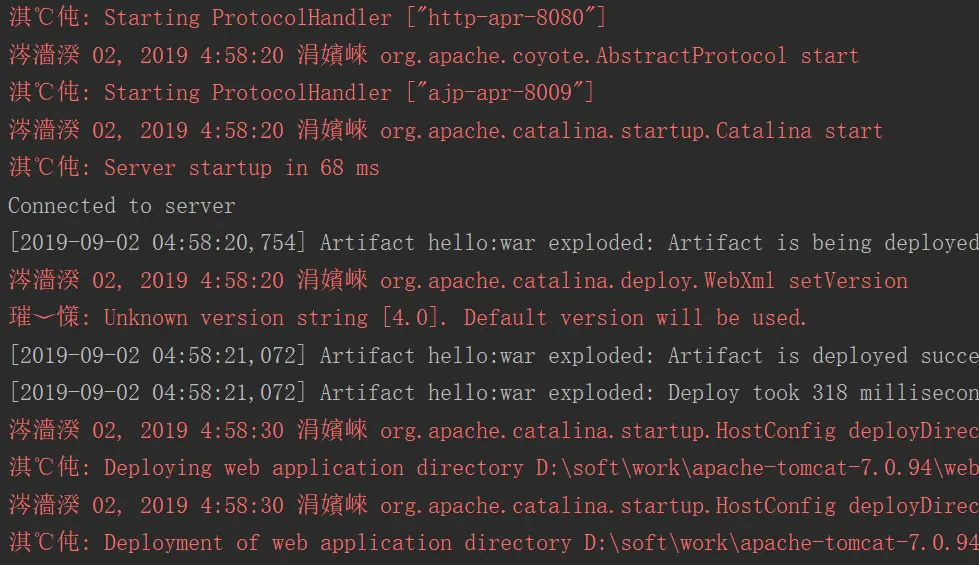 也许你会遇到这种情况,idea中的tomcat插件启动之后,控制台出现中文乱码,如下图所示