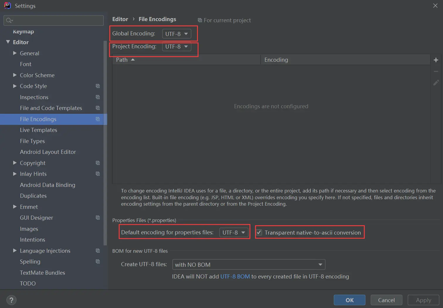 2.打开IntelliJ IDEA>File>Setting>Editor>File Encodings,将Global Encoding、Project Encoding、Default encodeing for properties files这三项都设置成UTF-8