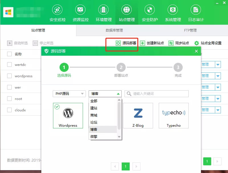 1、登陆管理面板进入站点管理页,点击源码部署,在这里我们可以一键快速部署包括 WordPress 在内的诸多 CMS 、论坛等