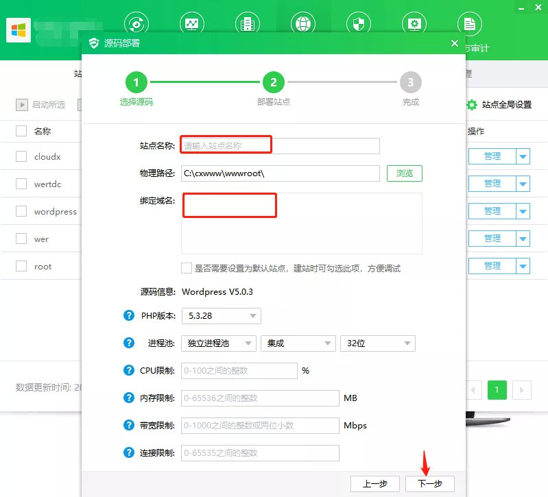 3、在部署站点页输入自己的站点名称和绑定域名,点击下一步 ;数据库和FTP页面可直接进入下一步