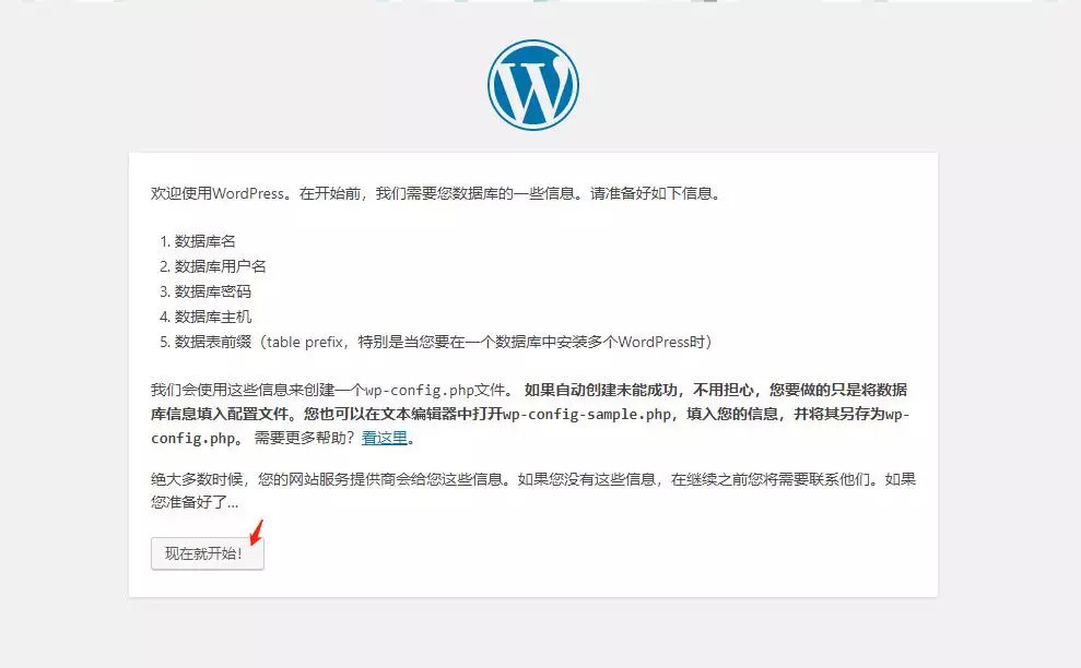 5、在浏览器内输入刚才的域名进行访问,此时可以看到 WordPress 后台的配置界面,点击现在就开始