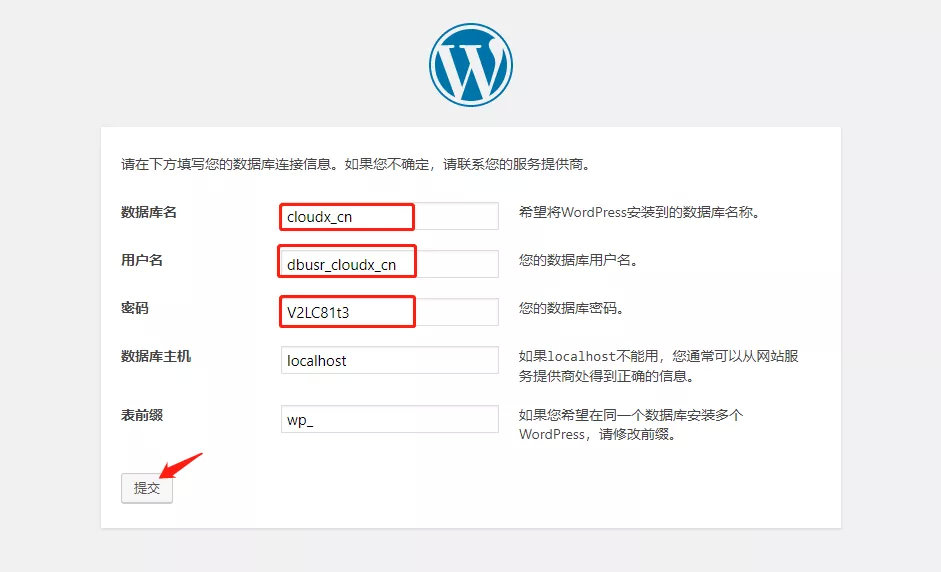 6、将步骤4内创建好的数据库信息复制粘贴下来,然后点击提交 ,进入最后的配置界面点击进行安装