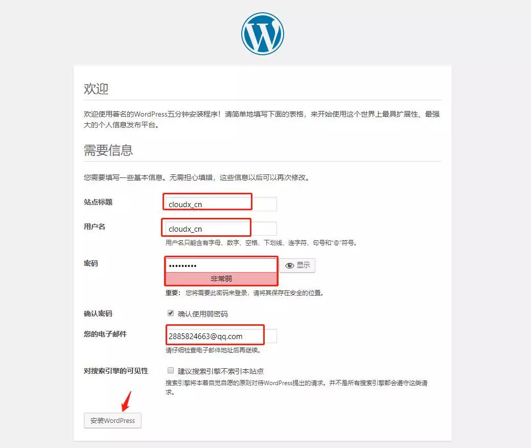 7、此时进入站点配置界面,输入站点标题、用户名、密码、邮箱,然后点击安装WordPress