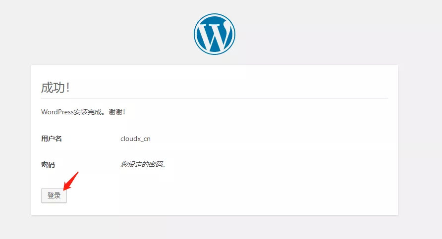 8、等待几秒后 WordPress 就已经安装完成,点击登陆按钮进入 WordPress 的后台进行页面设置