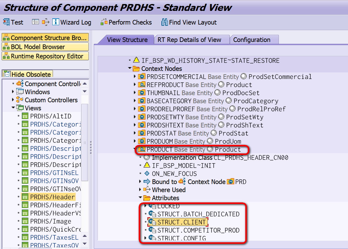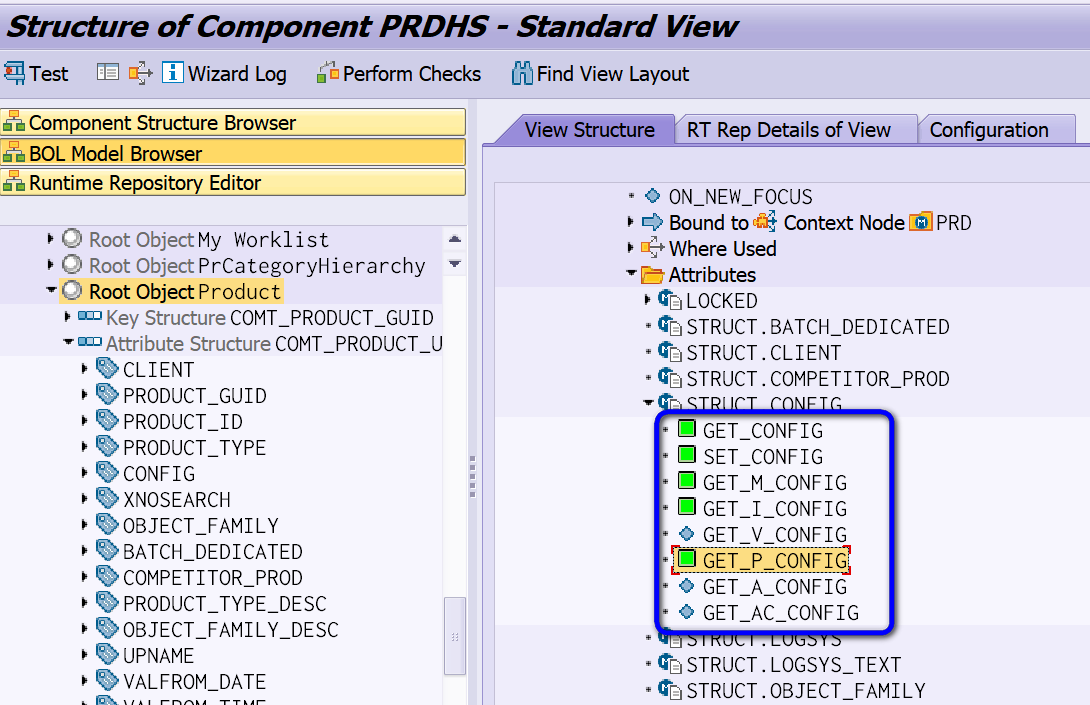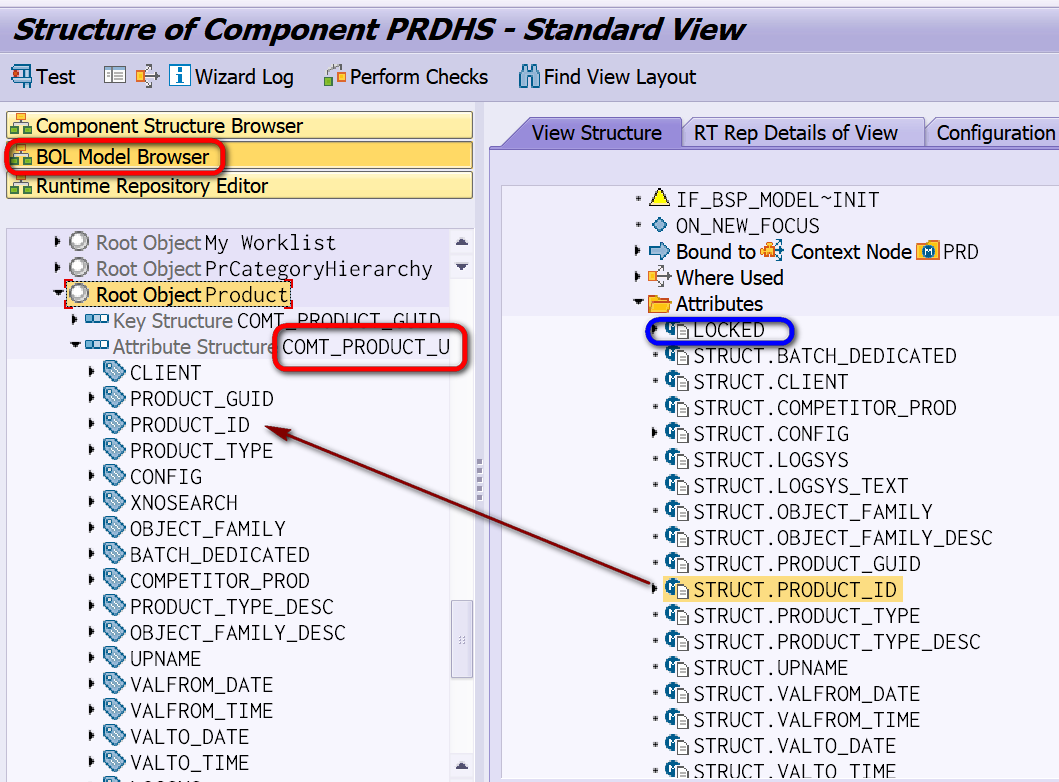 在UI层的CRM BSP component的MVC设计里,Model,即Context node,绑定的是Business Object Layer的模型,因此Context node Attributes文件夹下面,以STRUCT开头的字段,意味着这个字段是绑定到BOL模型节点里的一个字段的,二者存在一一对应关系,如下图箭头所示。而下图蓝色字段LOCKED, 前面没有STRUCT前缀,说明这个字段并非来自BOL模型节点,而是开发者直接创建的,这种字段一般用于应用逻辑里存储临时状态,或是代表当前应用的某个标志位,没有对应的底层存储,在SAP很多产品里也称这种字段为transient field或者calculated field.