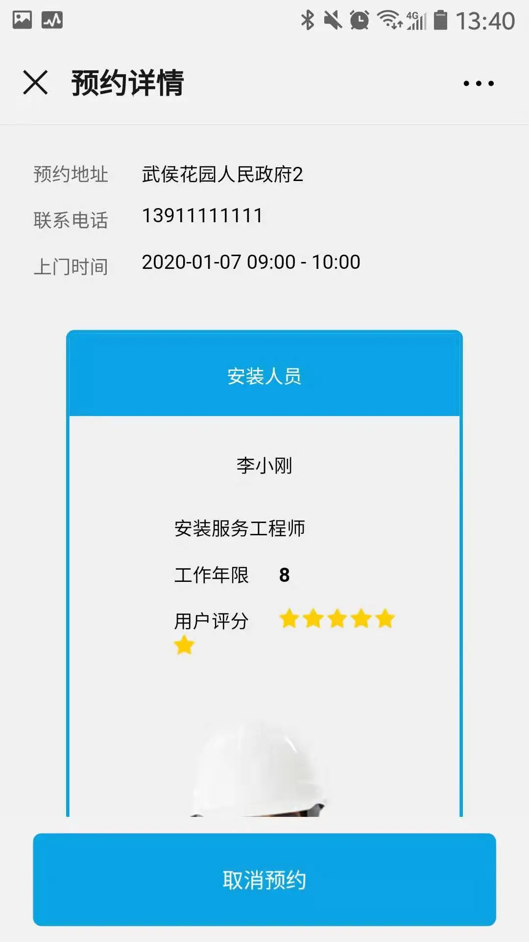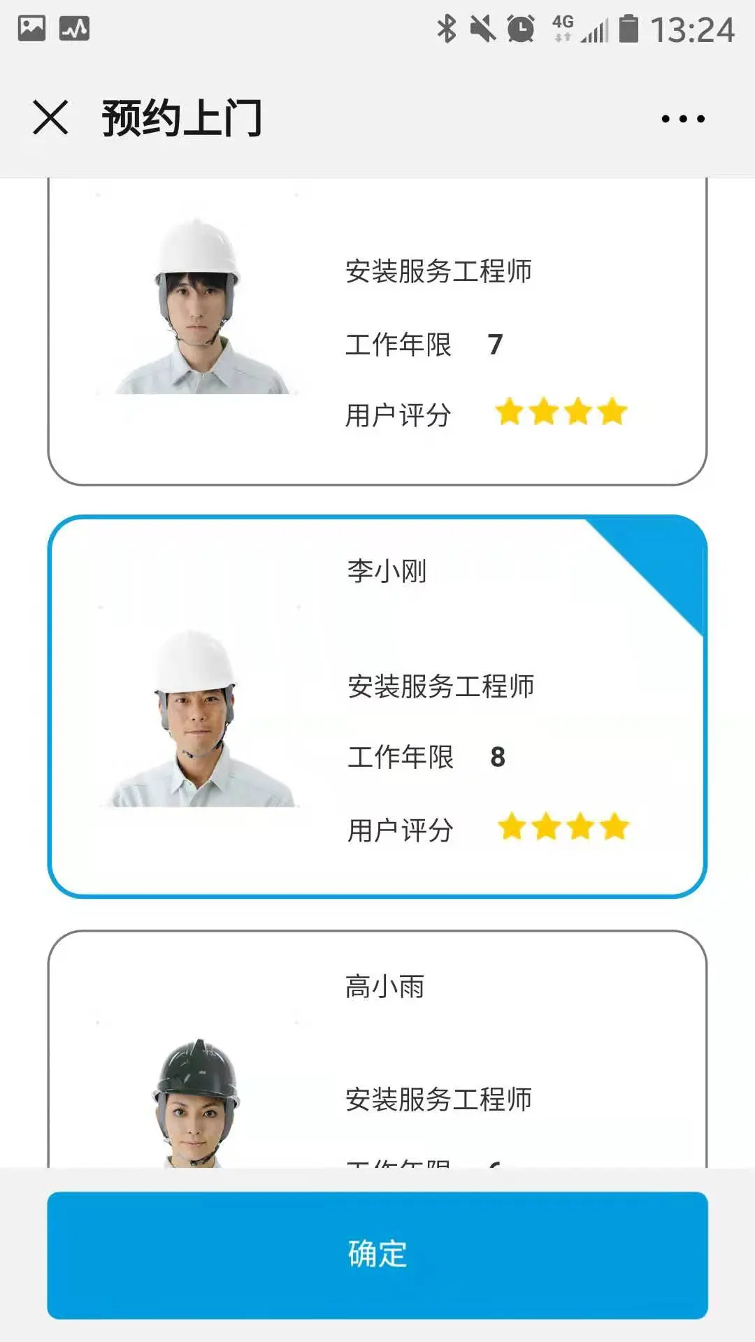 维护手机号和希望上门安装的具体时间段,然后就可以从下拉列表里选择该时间段内可以提供服务的安装技师。这里我们选择名叫李小刚的技师: