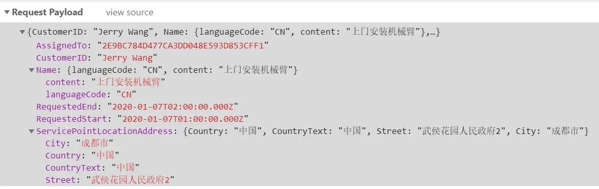 请求正文里包含了微信里填入的全部预约信息,和李小刚在FSM里的GUID. CustomerID,则是前端应用通过我的微信open ID调用微信API获取到的昵称,Jerry Wang. “上门安装机械臂”,是我们为了demo方便,硬编码的一个预约标题。