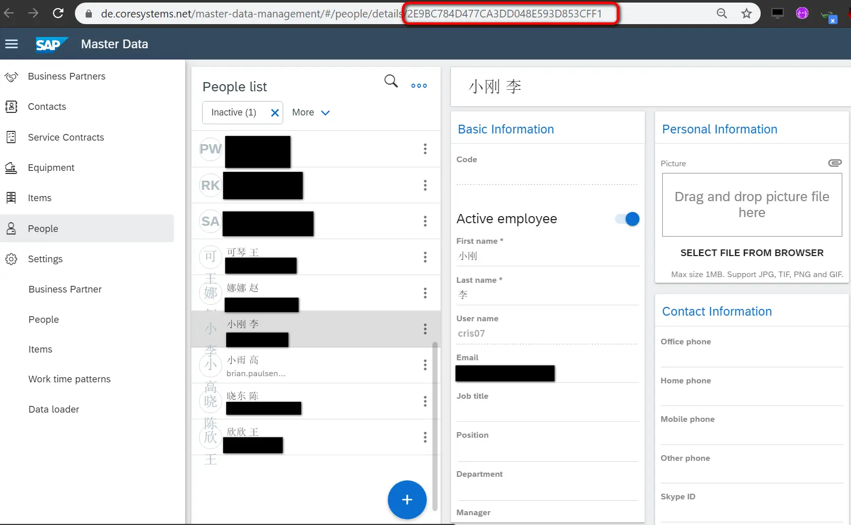 而我们在微信预约页面选择的技师李小刚,在微信开发者工具里观察到其GUID为2E9BC784D477CA3DD048E593D853CFF1,这也正是李小刚在SAP FSM里的明细页面列表url的片段之一: