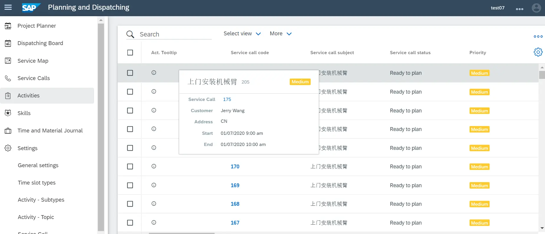 在SAP FSM的Activities页面可以查到这条编号为205的记录,其所属的Service Call为175,即上图显示的Call内容。