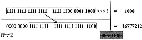 console.log(-1000 >>> 8); //返回值 16777212 用算式进行演示,如图所示。左侧空位不再用符号位的值来填充,而是用 0 来填充。