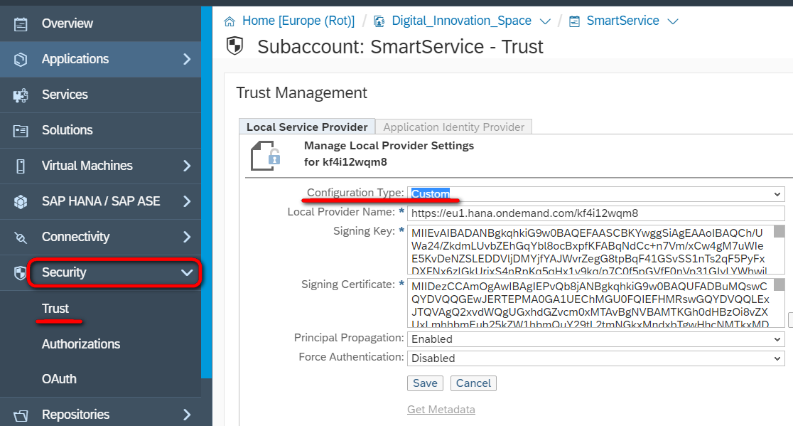 选择subaccount登录进去,选择Security菜单项下面的Trust,将Configuration Type设置为Custom,
