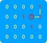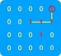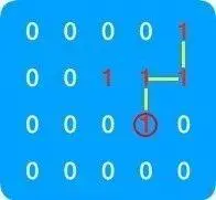 - 再次寻找这两个元素上下左右皆为 1 的元素,可知符合条件的元素为步骤 3 中的红框元素,由于此元素是当前正在遍历序列中已遍历过的元素,所以不符合条件,序列的遍历到此终止,至此我们可以知道,从右上角元素为起点的序列和的最大值为 4 ,连接遍历过的元素,如图示