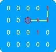 3. 再以这个元素为起点查找这个元素前后左右值为 1 的元素,可以看到这个元素的上,左元素值为 1,左边的元素显然符合条件,而上面的元素由于是当前正在遍历序列中遍历过的元素,所以不符合条件(假设上面的元素符合条件,会发生什么?接下来会寻找以上面元素为起始点的序列,又回到了第一步,陷入无限循环,所以元素的下一个值为 1 的元素不能是当前正在遍历的序列中的元素!,这一点是解题的关键,务必要注意!)由此可知此时符合条件的元素如下红圈所示