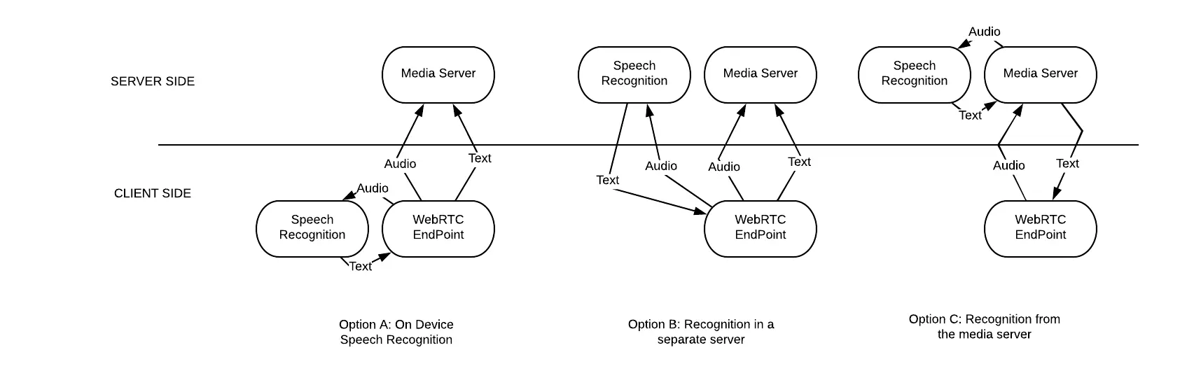 B)单独服务器中的识别:这种方案是种低效的网络传输。因为客户端需要同时发送两次音频。这对服务供应商而言成本太高。但不需要在媒体服务器中进行更改。