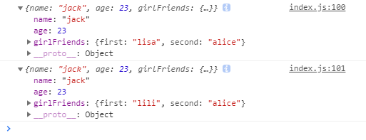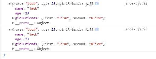 可以看到,obj和newObj对象中,girlFriends属性所指向的对象仍然是同一个,这时我们需要对clone函数进行递归改写: