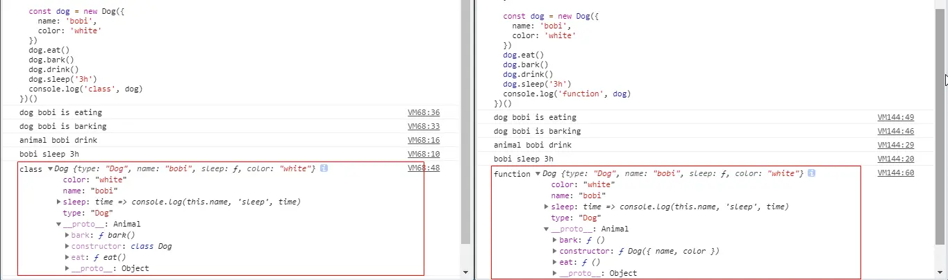 class Animal { static Is = 'Animal' // 静态属性 constructor({ type, name }) { // 构造器函数 this.type = type this.name = name // 对象上特有的方法 this.sleep = time => console.log(this.name, 'sleep', time) } eat() { // 原型上的方法 console.log('animai', this.name, 'eat') } drink() { console.log('animal', this.name, 'drink') } } class Dog extends Animal { static Is = 'Dog' constructor({ name, color }) { super({ name, type: 'Dog' }) this.color = color } // 新增Dog的原型方法 bark() { console.log('dog', this.name, 'is barking') } // 覆写原型上的方法 eat() { console.log('dog', this.name, 'is eating') } } const dog = new Dog({ name: 'bobi', color: 'white' }) dog.eat() dog.bark() dog.drink() dog.sleep('3h') console.log('class', dog) -