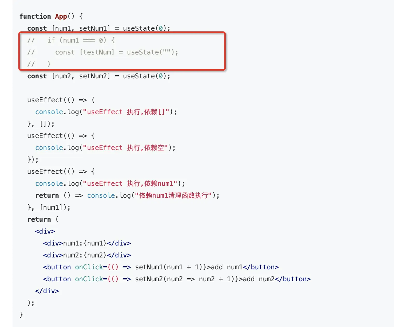 console.log("useEffect 执行,依赖num1");