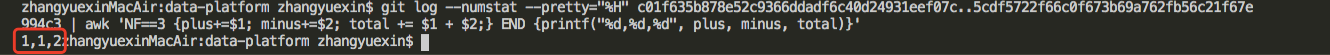 git log --numstat --pretty="%H" ${startCommit}..${endCommit} | awk 'NF==3 {plus+=$1; minus+=$2; total += $1 + $2;} END {printf("%d,%d,%d", plus, minus, total)}'