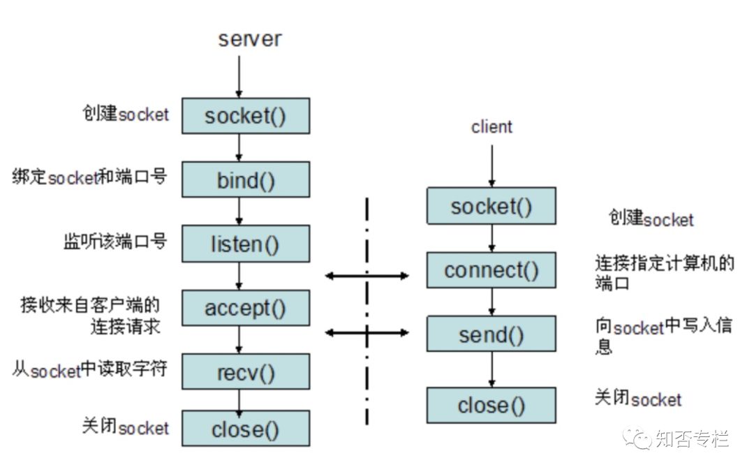 以使用TCP协议通讯的socket为例,socket通信交互流程大概是这样子的