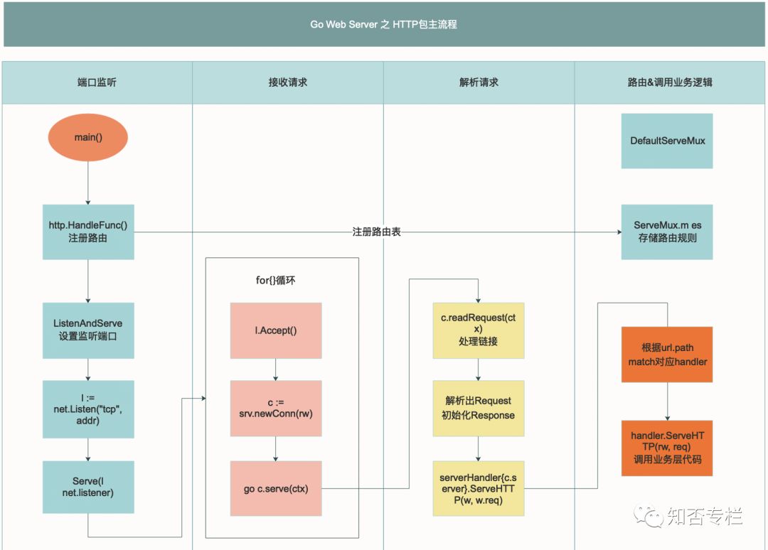 实际上 Go 的 web server 也就是这么个处理逻辑,只是在这多了一些处理逻辑:请求的协议解析,读取客户端提交的数据,路由分配(根据请求分配对应的 handler 处理请求),封装响应数据。