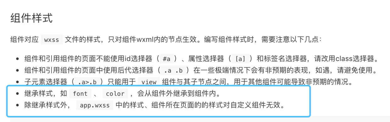 需要注意的是,例如你在一个page里引用了一个自定义的组件,这时候组件的font-family和font-size会继承app.wxss里的全局样式,除了font-family和font-size以外的其他样式,组件都不会继承。但是page页面里基本都会继承app.wxss里的全局样式。