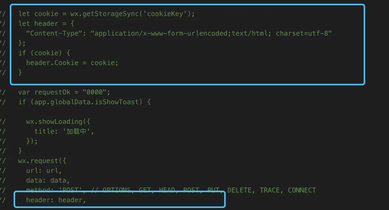 2、wx.request再从Storage中取出Cookie,封装到header中