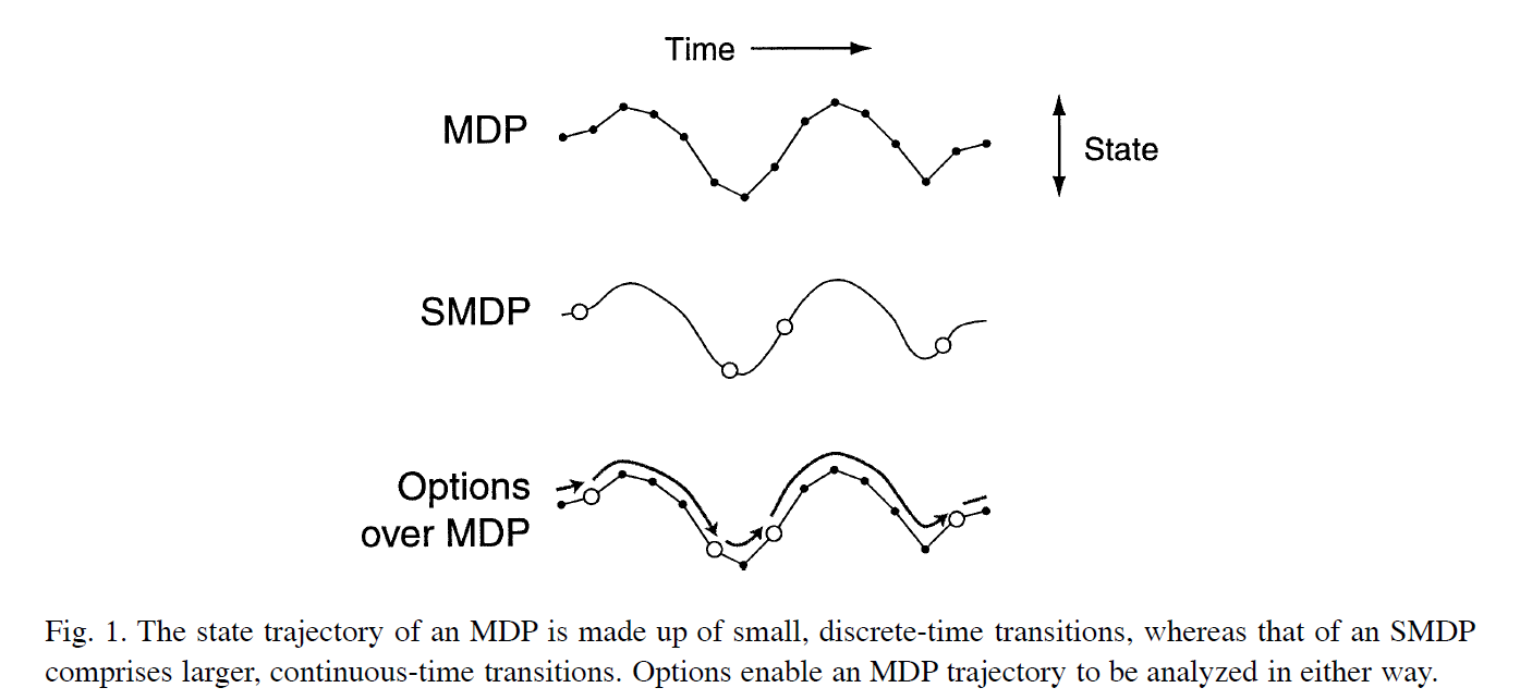 第三条轨迹是options over MDP,可以看做是我们把MDP抽象出一些间隔不均等的timepoints,得到了SMDP