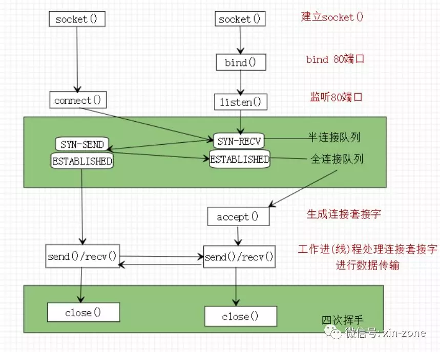 客户端发送SYN报文到服务端指定端口比如httpd的默认80端口;此时客户端的状态变为SYN-SEND;服务端收到SYN报文之后,将这个连接状态,存储到半连接队列中,同时服务端的状态变更为SYN-RECV;然后服务端立刻回一个ACK报文给客户端;客户端收到ACK之后,回给服务端一个ACK,服务端收到这个ACK之后,客户端跟服务端都变为ESTABLISHE状态;表明TCP三次握手成功。这个时候会把半连接队列中的连接,转移到全链接队列。全链接队列中的连接都是已经完成三次握手的连接。监听进(线)程监听监听套接字,就是工作在上面这个过程的。