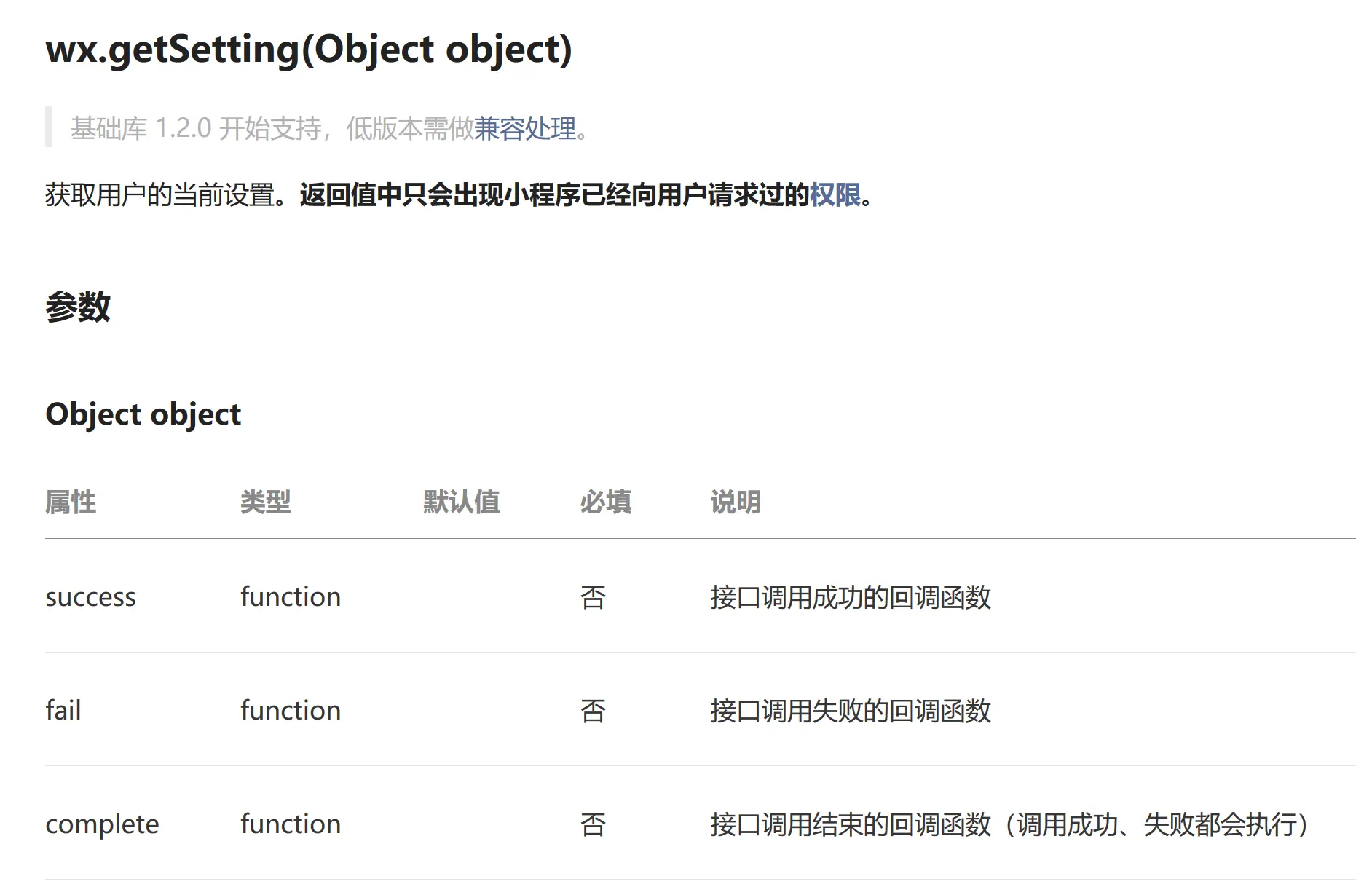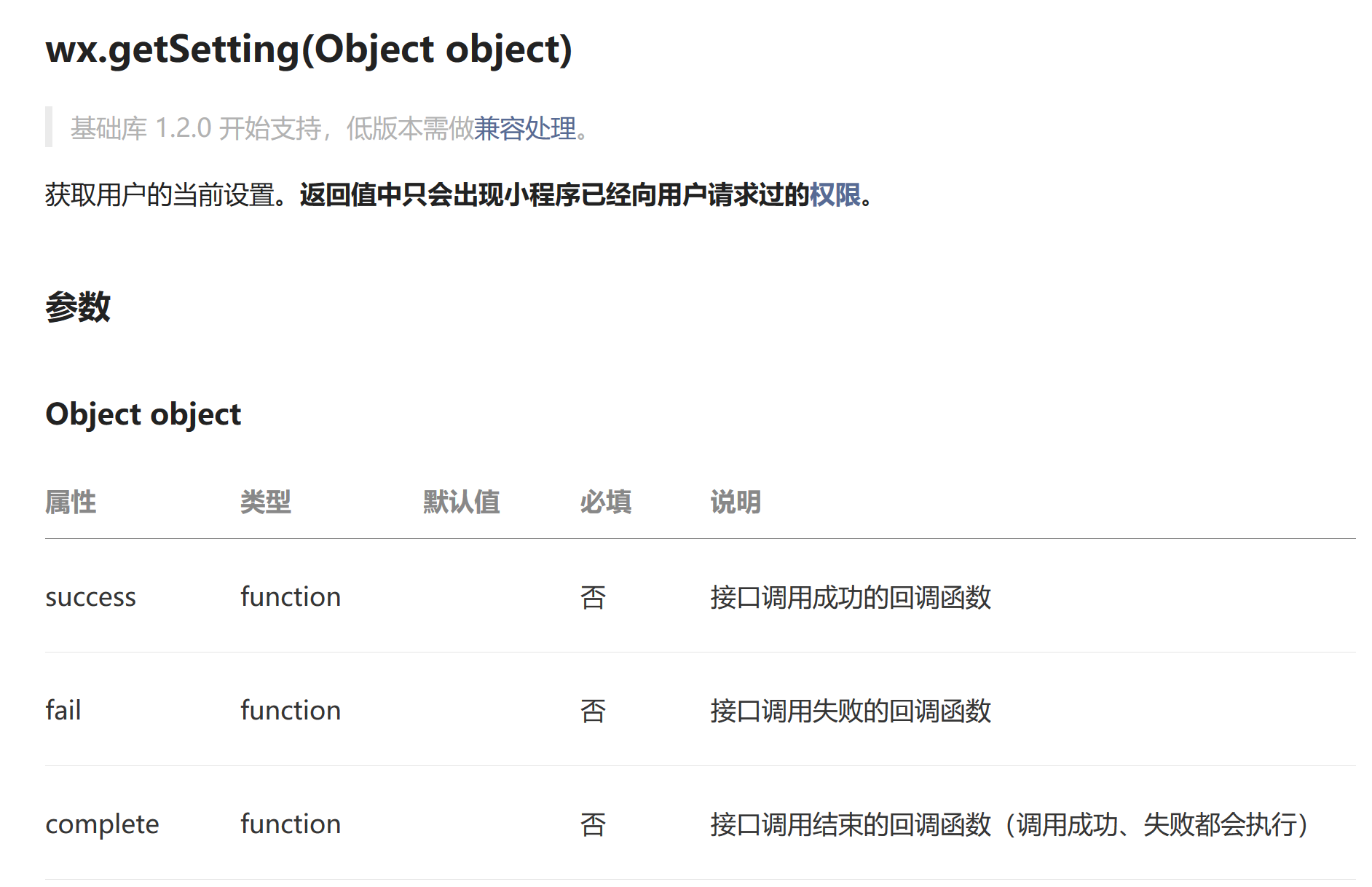 我们需要对用户进行权限校验,判断用户是否已经对小程序进行过权限设置,我们来看一下小程官方文档中对wx.getSetting()的定义,他接受一个Object参数,有三个回调函数,我们通常只用到success和fail参数