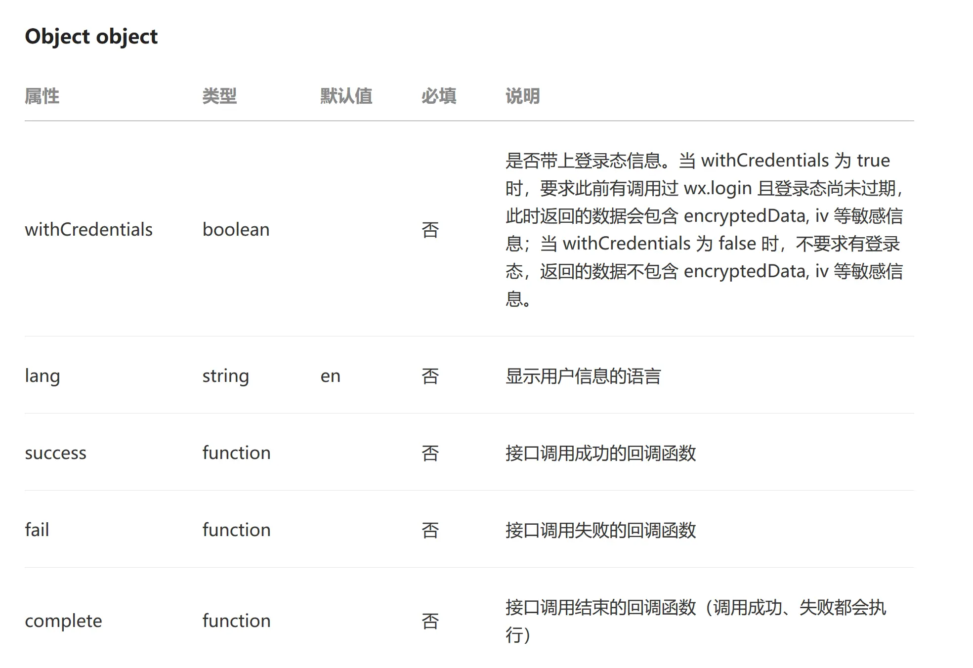 让我们来看一下wx.getUserInfo()获取用户信息,也是拥有success、fail回调函数。该函数调用成功后顾名思义会返回用户的信息,包括头像、名称等