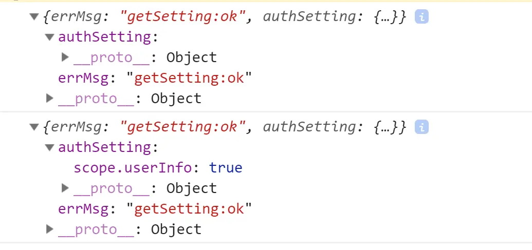 获得用户权限后我们再来看下wx.getSetting()返回的数据吧,authSetting下的scoped.userInfo 变为了true