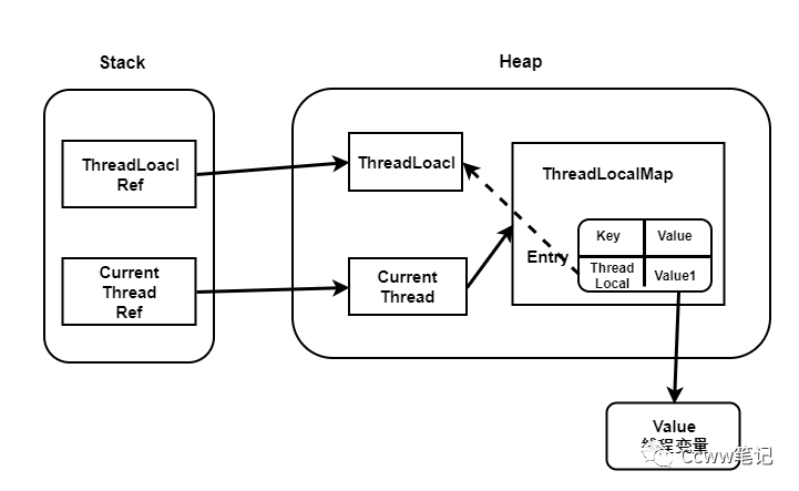 Thread Ref -> Thread -> ThreaLocalMap -> Entry -> value